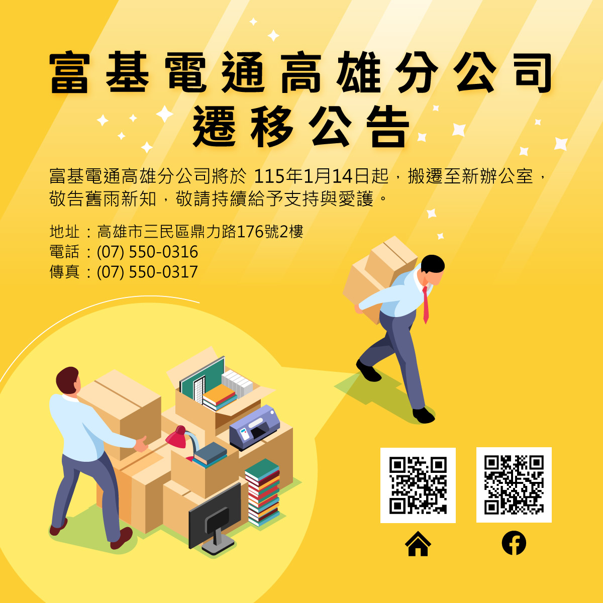 富基電通高雄分公司將於115年1月14日起,搬遷至新辦公室,敬告舊雨新知,敬請持續給予支持與愛護。