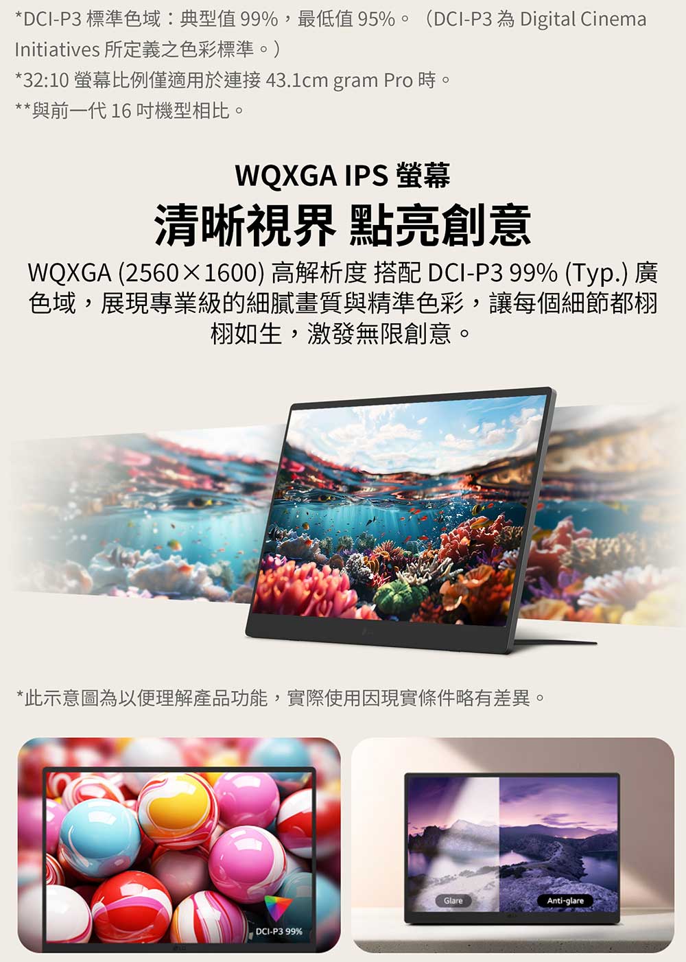 • 支援 DCI-P3 99% (Typ.) 廣色域