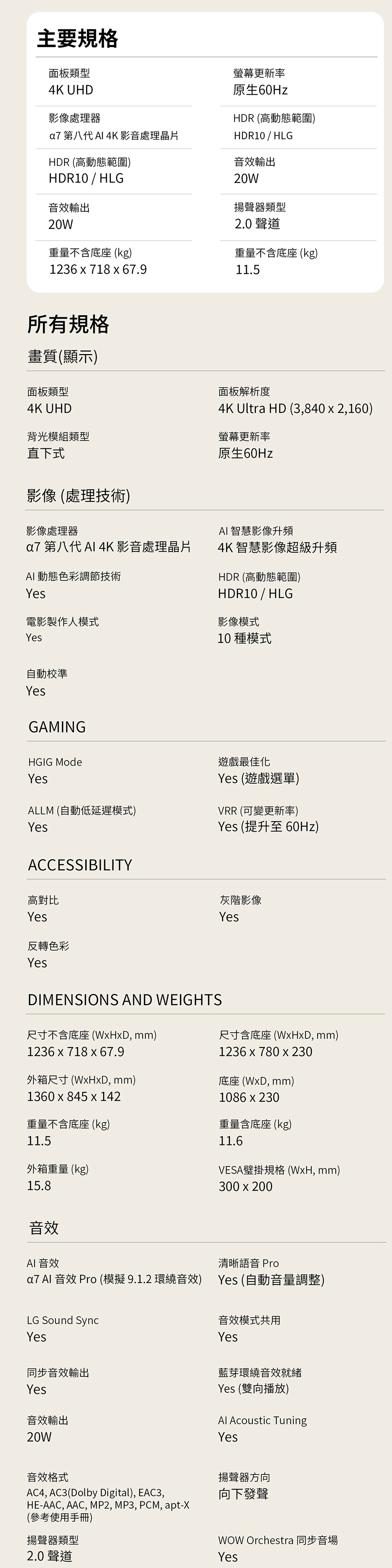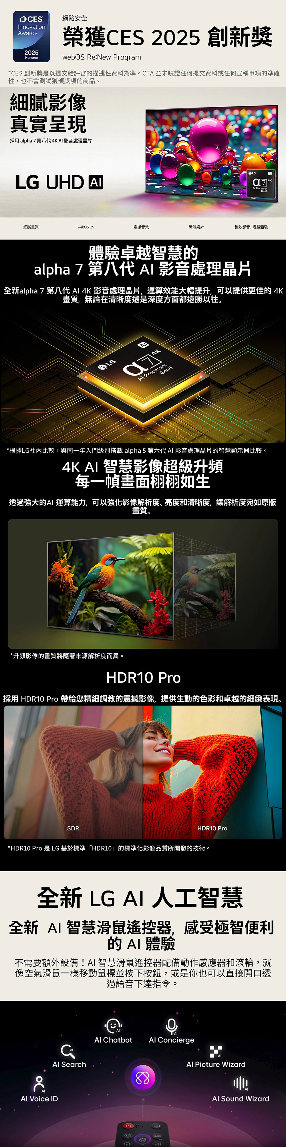 55UA7550PTA 55 吋|LG UHD AI 4K 智慧顯示器|75系列 α7 第八代 4K AI 影音處理晶片,讓畫質細膩提升影音體驗 全新AI智慧滑鼠遙控器 | 透過AI 搜尋、聲紋辨識、語音控制更便利 4K HDR10 Pro 呈現真實細膩的影像,帶給您無與倫比的臨場感。 webOS 5年升級保證,將於5年內進行4次升級,隨時掌握最新功能與技術。 超纖薄設計完美融入您的居家空間 看更多 顏色 規格 55型 Download File