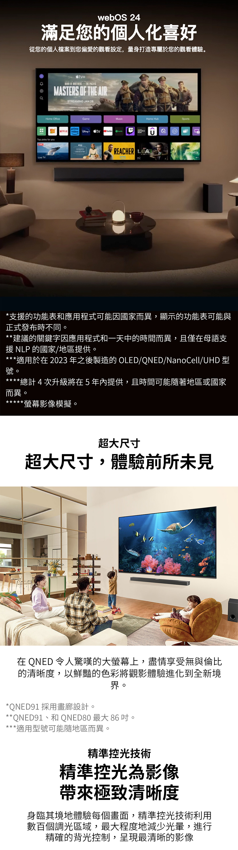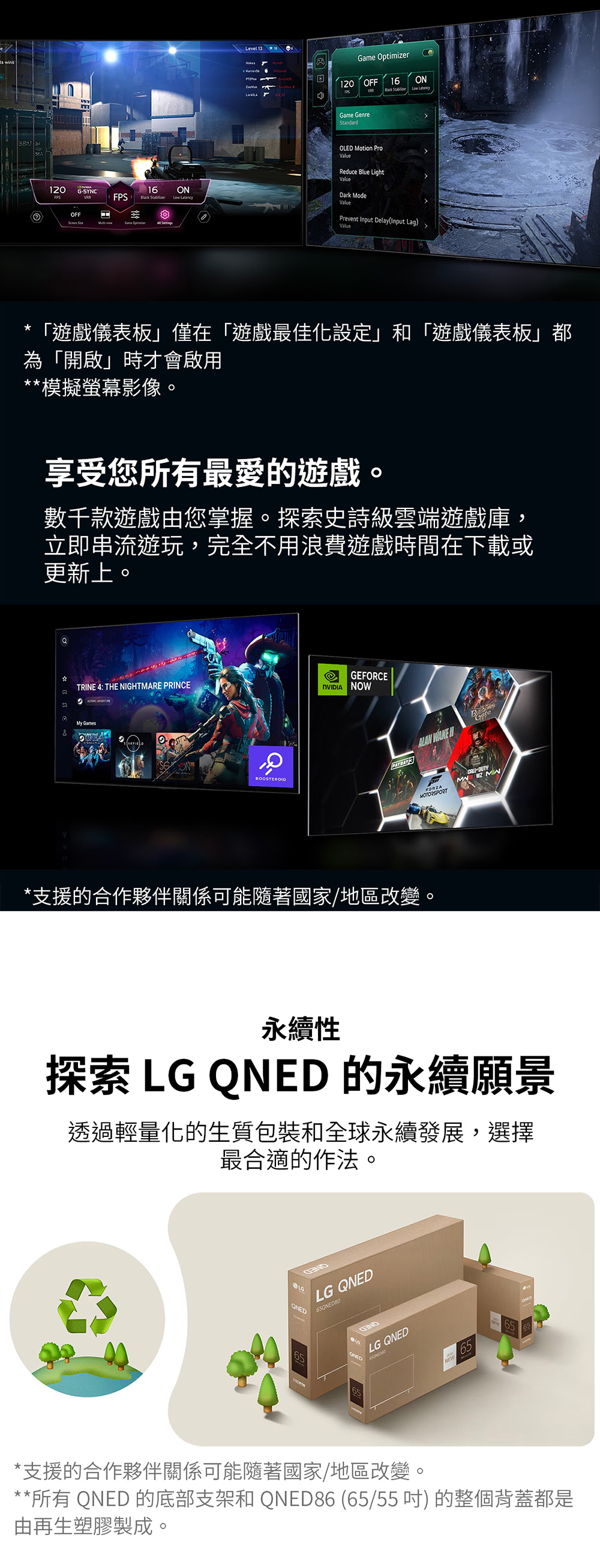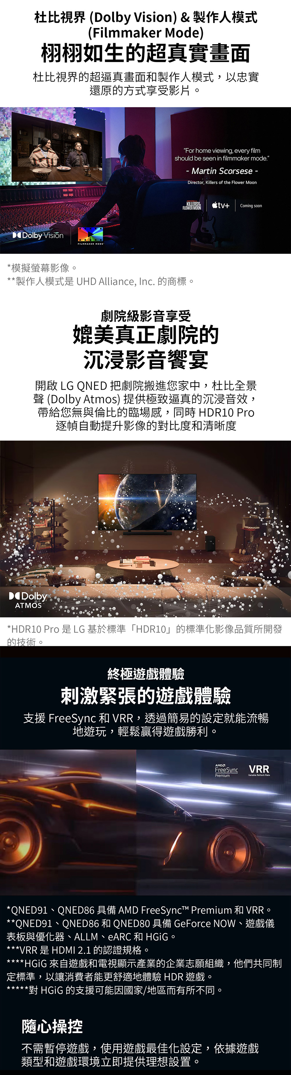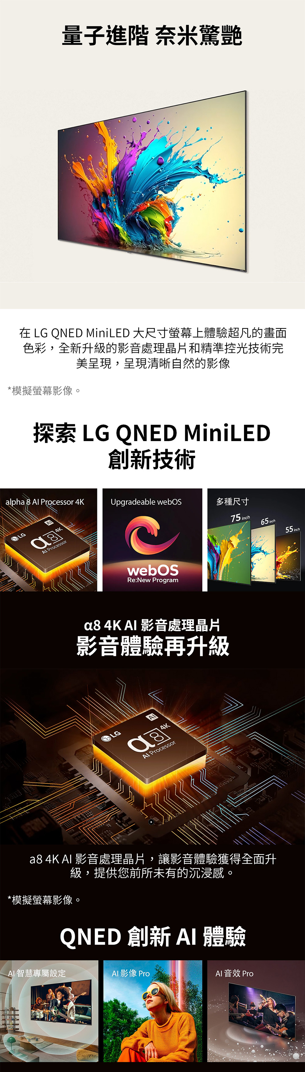 75QNED91TTA 75 吋 /QNED MiniLED 量子奈米 4K AI 語音物聯網 91 系列 (可壁掛) 量子進階 奈米驚豔 | Quantum Dot 量子點增色+NanoCell 一奈米控色 全新 α8 AI 4K 影音處理晶片,呈現更清晰的畫質及音效,將觀影體驗提升至全新境界 精準控光技術減少光暈呈現超清晰、輪廓分明的細節 webOS 5 年升級保證 + 智慧滑鼠遙控器 | 持續升級人性化操作 杜比全景聲、 杜比視界及製作人模式 (FILMMAKER Mode) 提供栩栩如生的畫面和震撼的音效 看更多 顏色 規格 75型 Download File