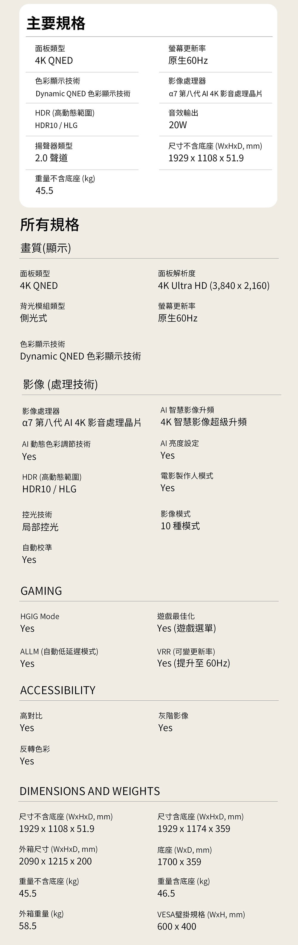 86QNED82ATA 86 吋|LG QNED AI 4K 智慧顯示器|82系列 全新動態 QNED Color | 提供更豐富飽滿的色彩表現 alpha 7 第八代 AI 4K 影音處理晶片 | 呈現更清晰的畫質及音效,將觀影體驗提升至全新境界 區域控光技術 | 畫面色彩準確、減少光暈,呈現最細膩的細節 全新AI智慧滑鼠遙控器 | 透過AI 搜尋、聲紋辨識、語音控制更便利 webOS 5年升級保證 | 持續升級人性化操作 看更多 顏色 規格 86型 Download File