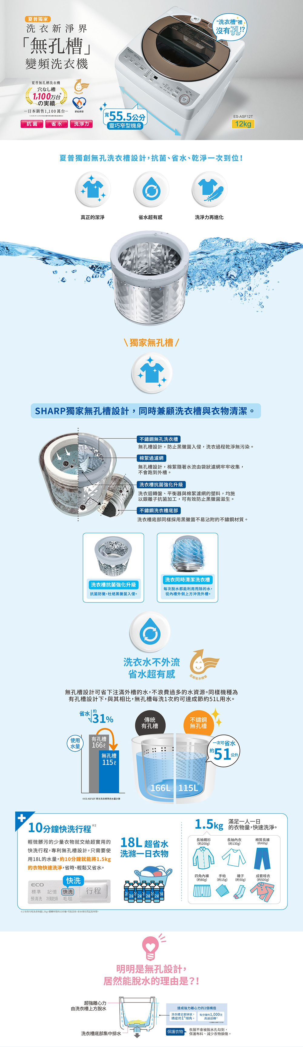 ES-ASF12T 無孔槽變頻洗衣機 專利不鏽鋼無孔槽 強力海豚迴轉盤 超靜音智能變頻馬達 洗衣槽抗菌防黴強化設計 鑽石切割內槽 防衣物糾結 低機身設計 9種洗衣行程 10分鐘快速洗行程 看更多 顏色 規格 ES-ASF12T Download File