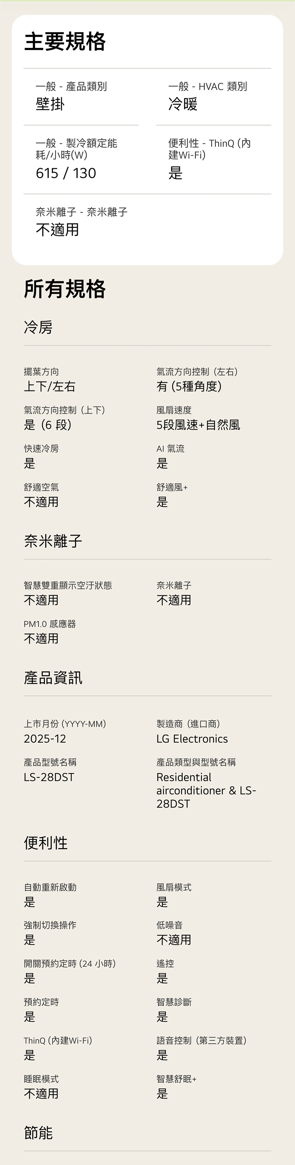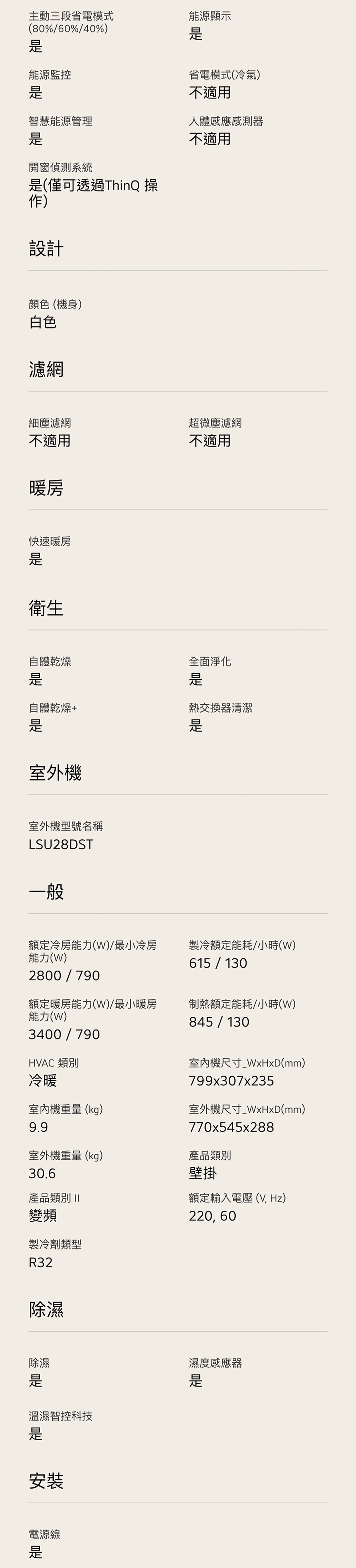 LS-28DST 建議3-5坪|WiFi 雙迴轉變頻空調|極效2.0系列|AI 氣流 & 內建 WiFi 內建 WiFi 模組,無需加購 雙迴轉變頻壓縮機 抗鏽蝕金散熱片 舒適風+,提供輕柔間接風 AI 氣流,一鍵舒適 三段省電模式(40%.60%.80%) 看更多 顏色 規格 LSN28DST/LSU28DST Download File