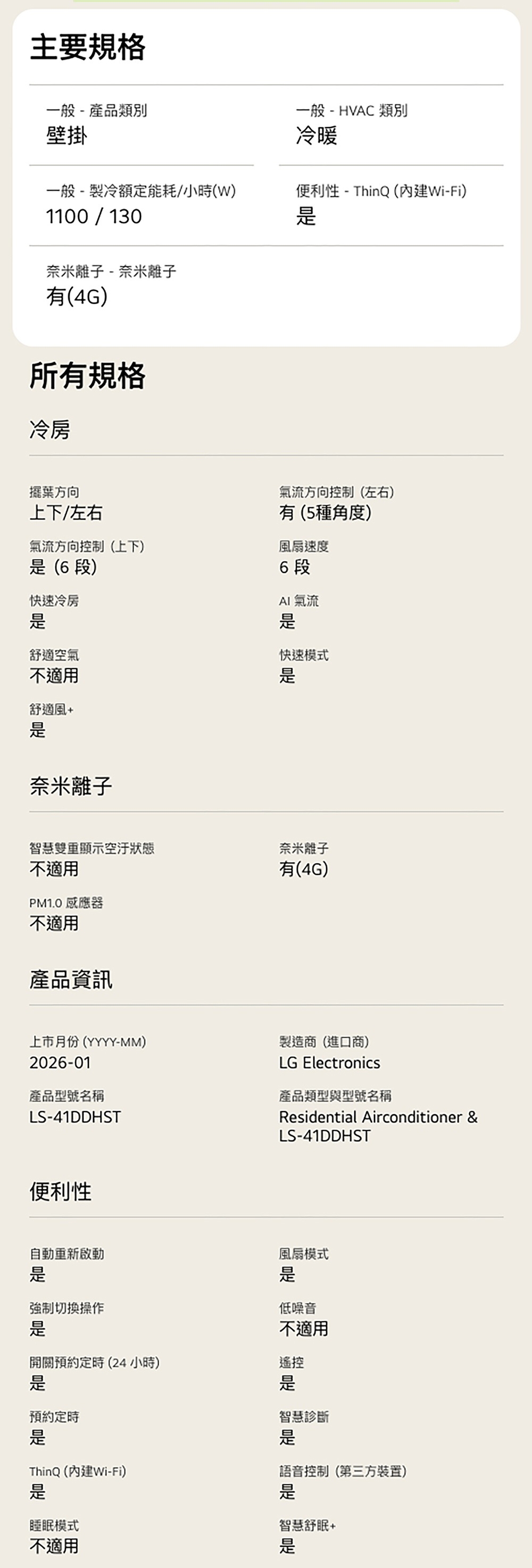 LS-41DDHST 建議5-7坪|WiFi 雙迴轉變頻空調|極淨2.0系列|AI 氣流 & 奈米離子 內建 WiFi 模組,無需加購 AI 氣流,一鍵舒適 AI 凍潔淨化,一鍵淨化 舒適風+,提供輕柔間接風 智慧電量管理,自主掌握能源使用 奈米離子抑菌 看更多 顏色 規格 LSN41DHST/LSU41DDHST Download File