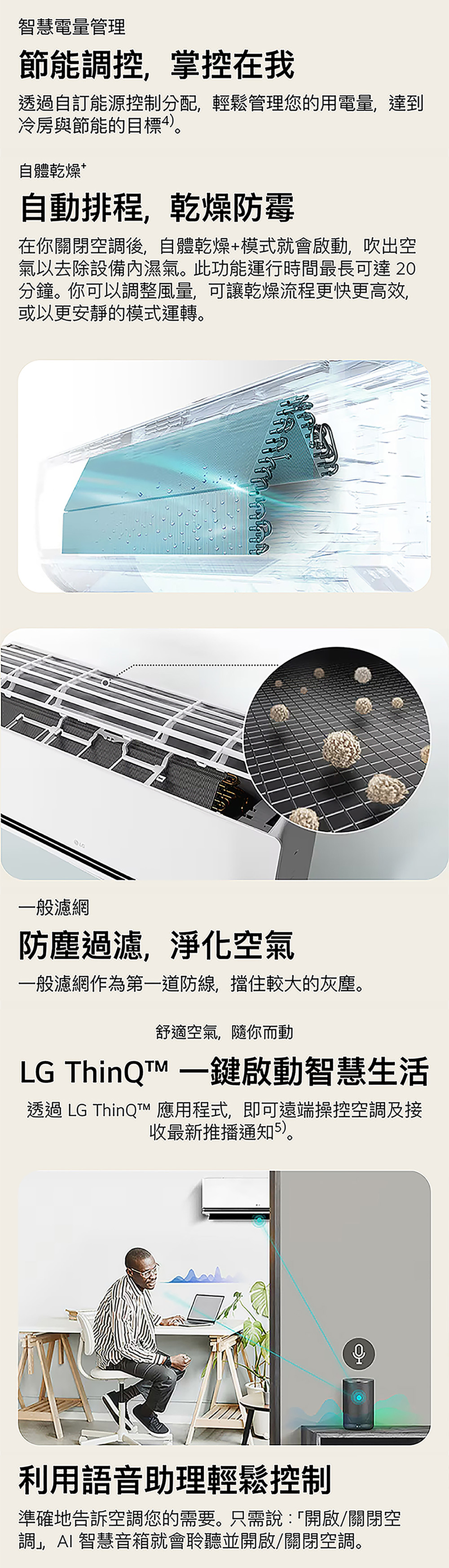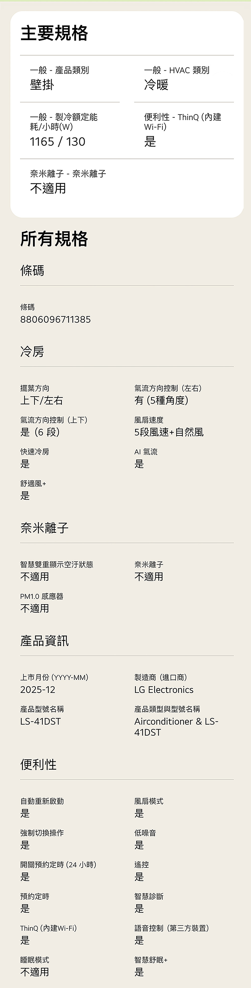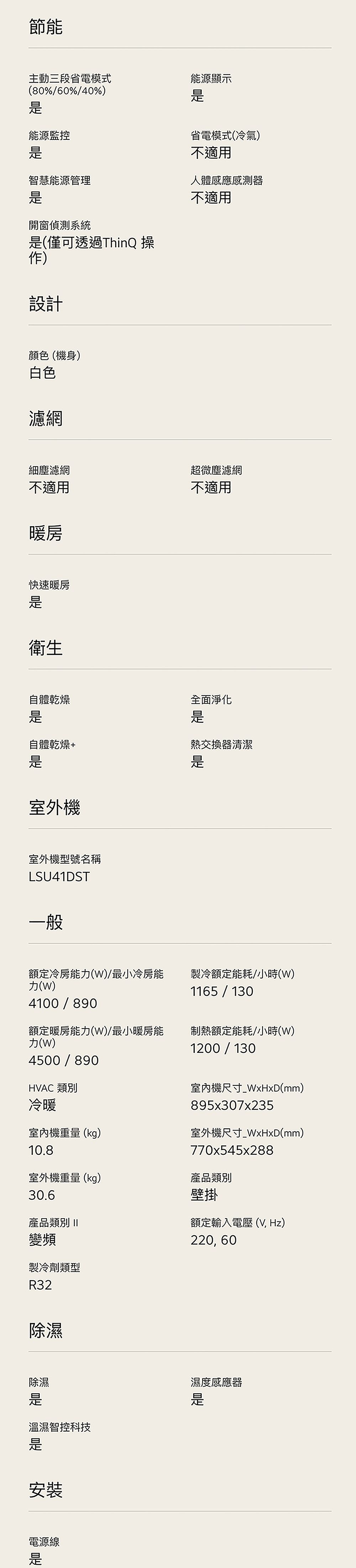 LS-41DST 建議5-7坪|WiFi 雙迴轉變頻空調|極效2.0系列|AI 氣流 & 內建 WiFi 內建 WiFi 模組,無需加購 雙迴轉變頻壓縮機 抗鏽蝕金散熱片 舒適風+,提供輕柔間接風 AI 氣流,一鍵舒適 三段省電模式(40%.60%.80%) 看更多 顏色 規格 LSN41DST/LSU41DST Download File