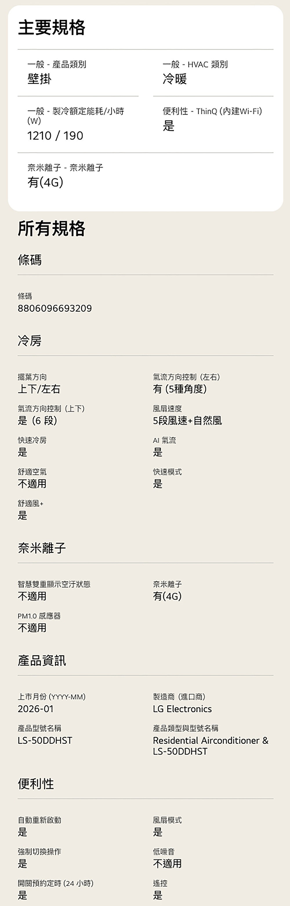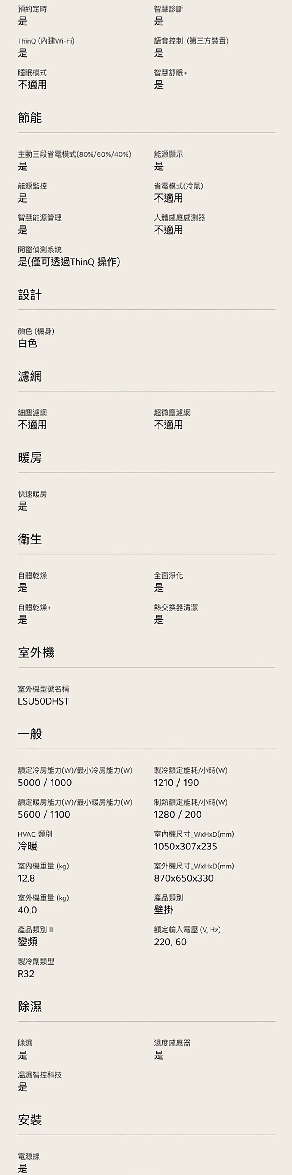 LS-50DDHST 建議6-9坪|WiFi 雙迴轉變頻空調|極淨2.0系列|AI 氣流 & 奈米離子 內建 WiFi 模組,無需加購 AI 氣流,一鍵舒適 AI 凍潔淨化,一鍵淨化 舒適風+,提供輕柔間接風 智慧電量管理,自主掌握能源使用 奈米離子抑菌 看更多 顏色 規格 LSN50DHST/LSU50DDHST Download File