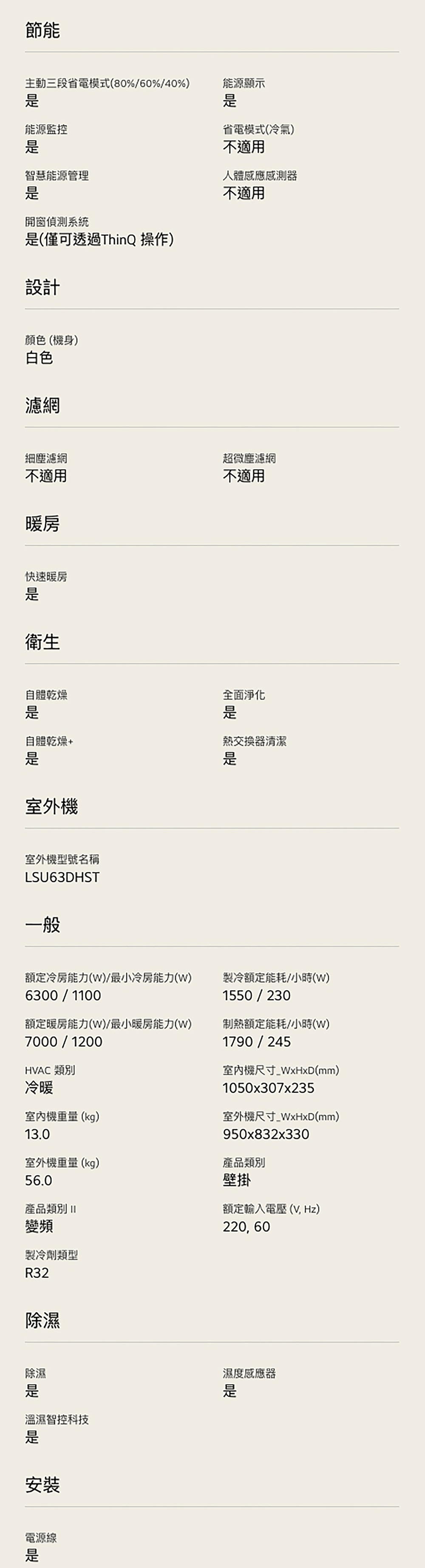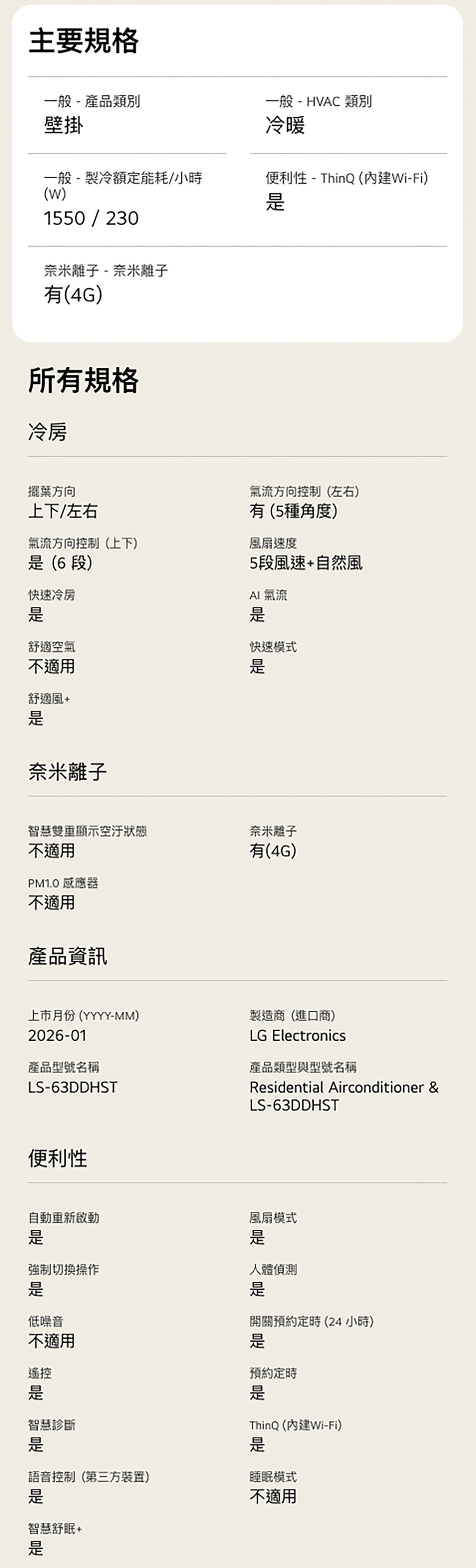 LS-63DDHST 建議7-10坪|WiFi 雙迴轉變頻空調|極淨2.0系列|AI 氣流 & 奈米離子 內建 WiFi 模組,無需加購 AI 氣流,一鍵舒適 AI 凍潔淨化,一鍵淨化 舒適風+,提供輕柔間接風 智慧電量管理,自主掌握能源使用 奈米離子抑菌 看更多 顏色 規格 LSN63DHST/LSU63DDHST Download File