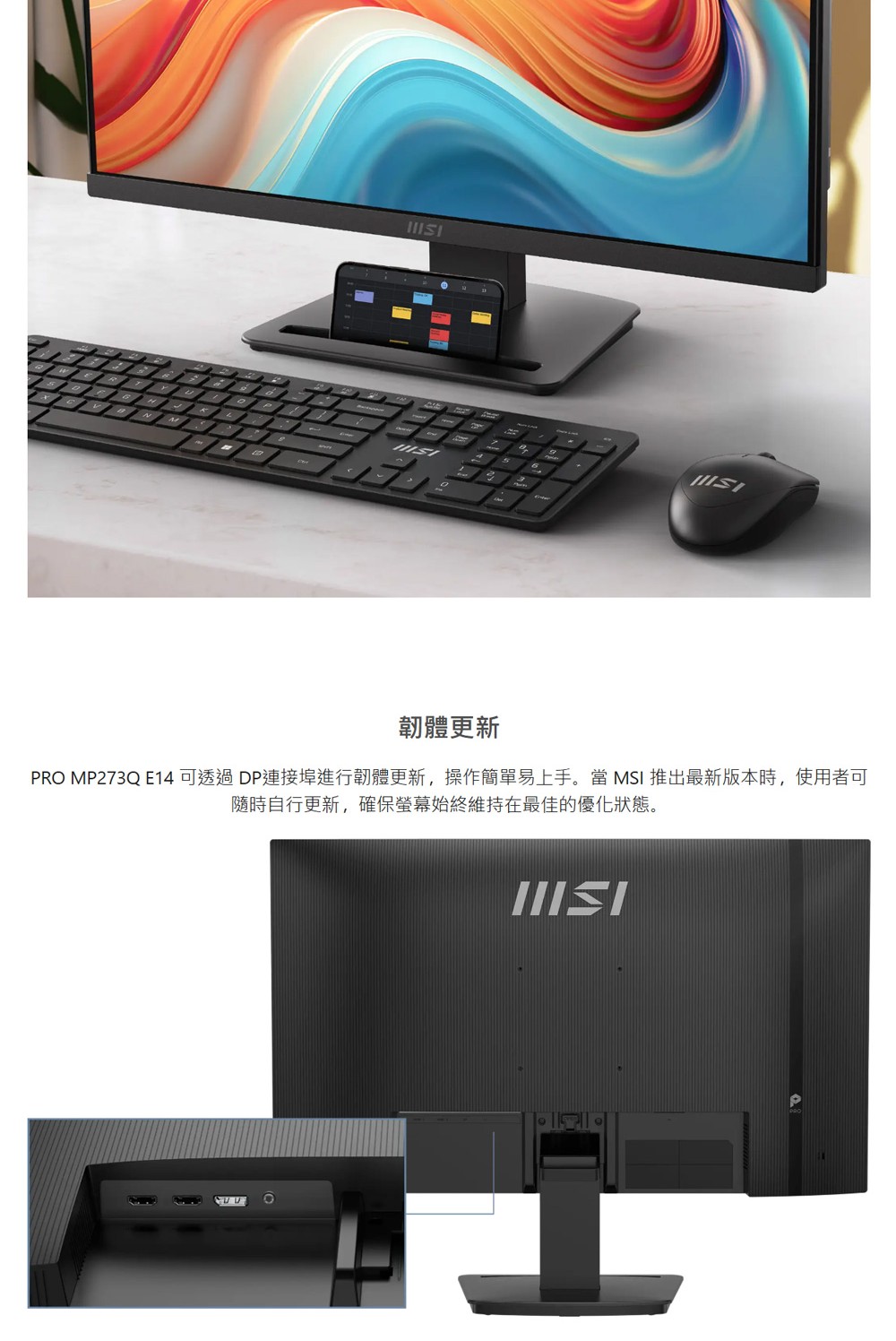 PRO MP273Q E14 電競顯示器 流暢的 144Hz 更新率帶來的高品質娛樂體驗 TÜV 認證顯示器,保護眼睛健康,降低視覺疲勞 MSI EyesErgo 防閃爍技術,有助於防止眼部疲勞 MSI Eye-Q Check 眼部檢查功能,有助於自我檢查眼睛,並在長時間使用顯示器時提醒使用者休息 透過 HDMI™ 和 DP 等多種連接埠,輕鬆連接各種設備 便捷可拆的線纜管理設計,享受整潔空間 標準 VESA 安裝與配件插槽設計 看更多 顏色 規格 PRO MP273Q E14 Download File