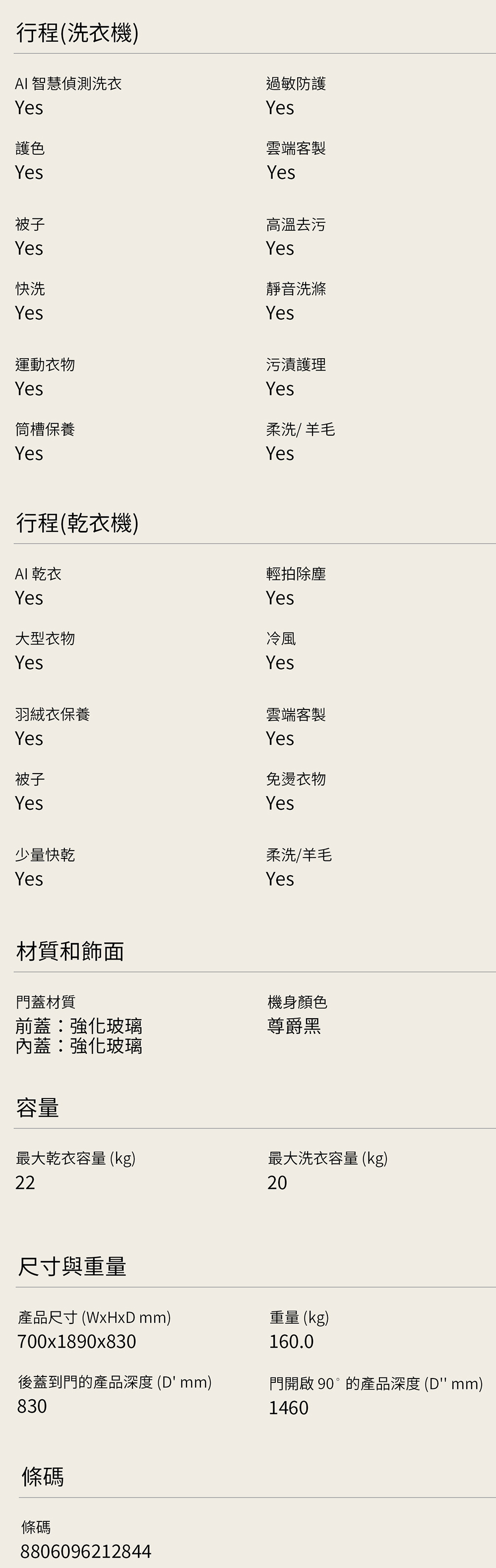 洗22公斤+乾20公斤 WashTower AI 智控洗乾衣機第二代|尊爵黑