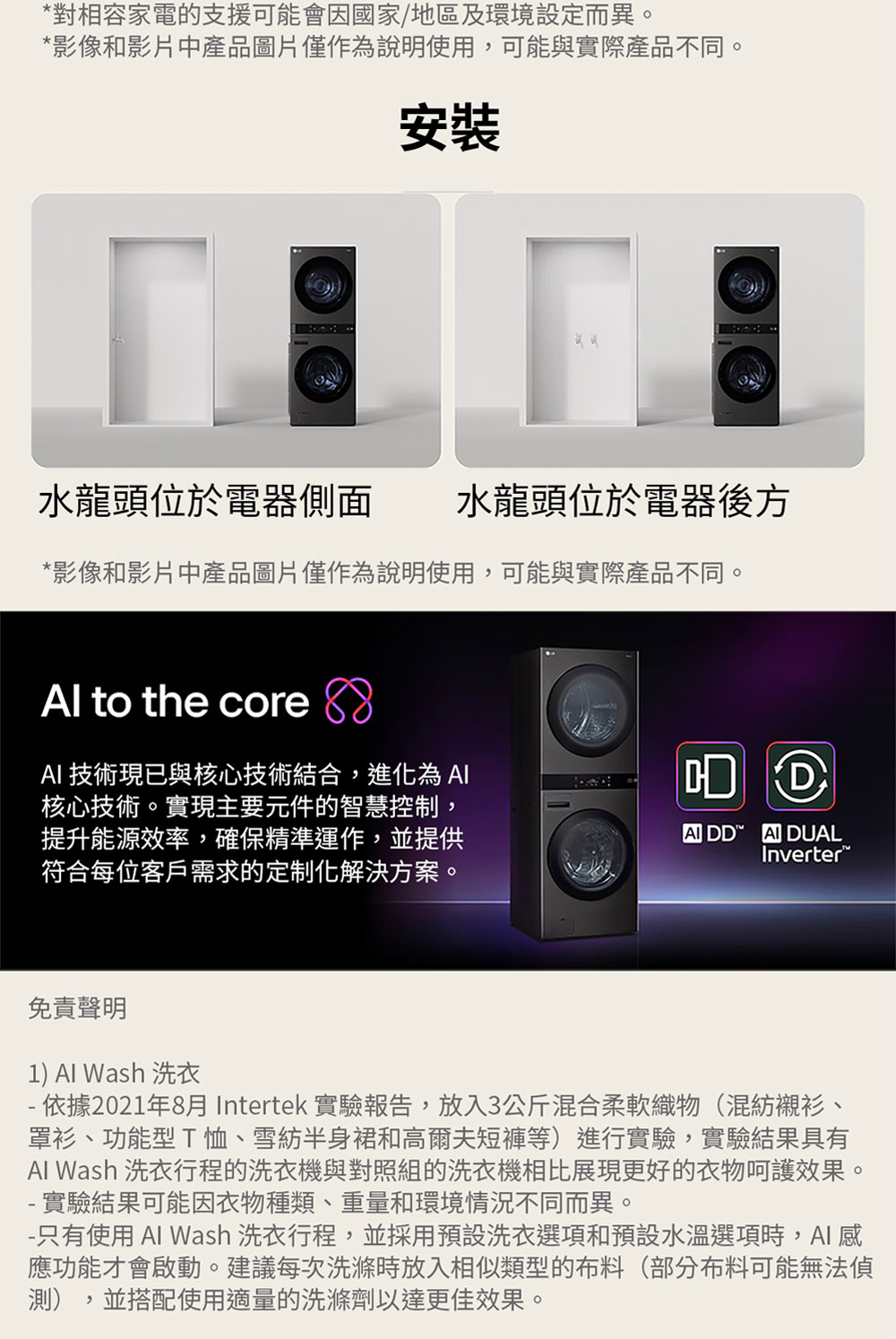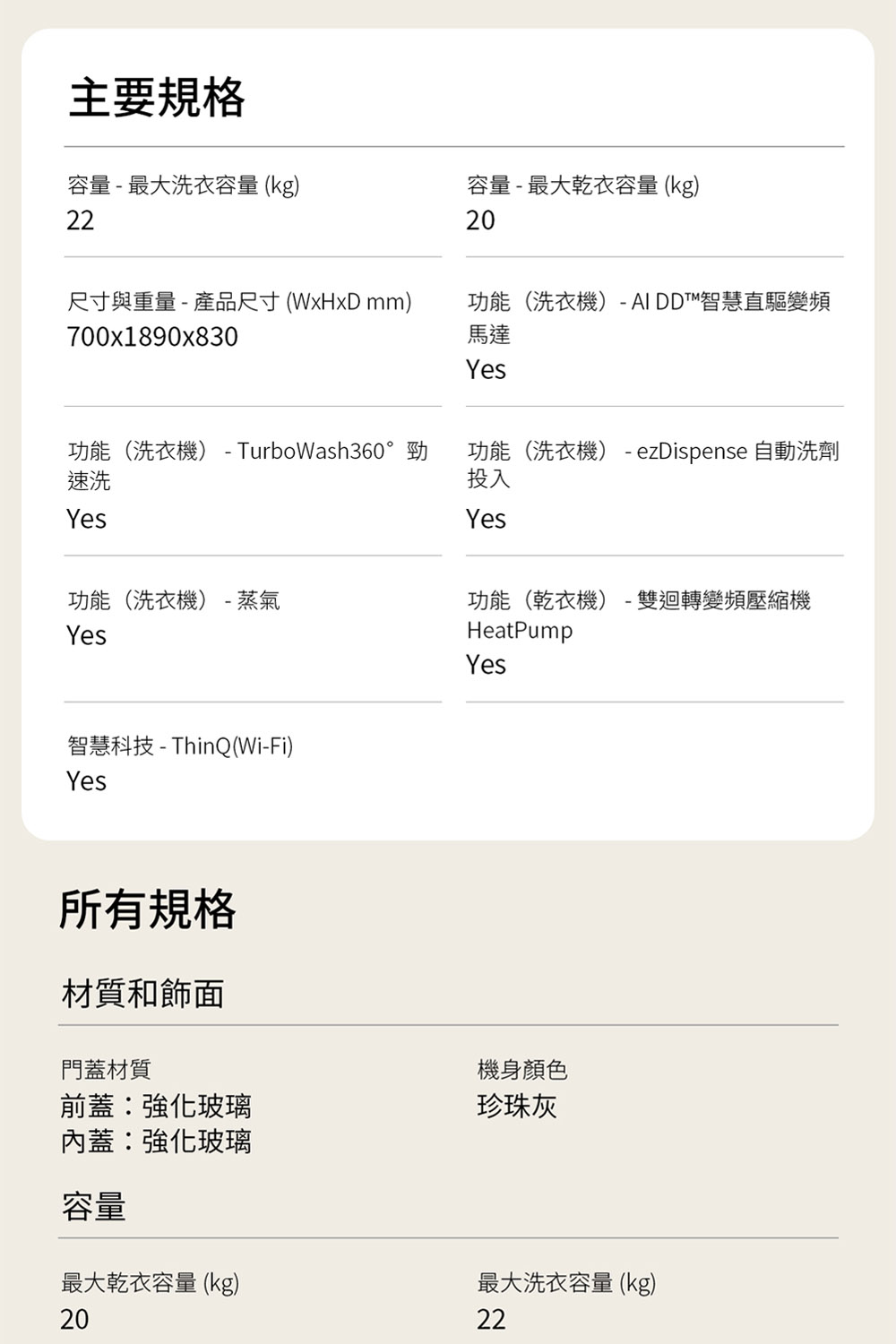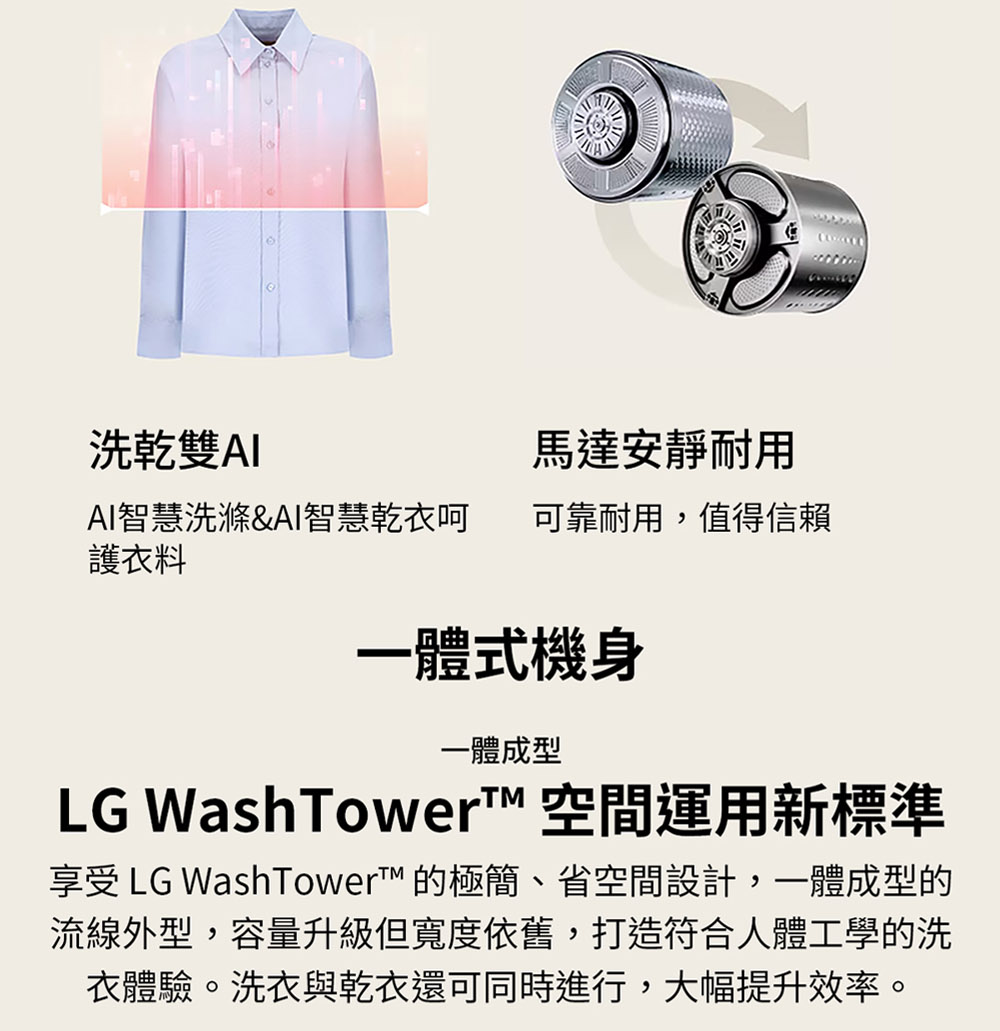 WD-S2220CG 洗22公斤+乾20公斤 WashTower™ AI 智控洗乾衣機第二代|熱泵除濕 一體成型,極簡流線外型設計 洗乾全 AI,AI DD 智慧洗滌+AI Dry 智慧乾衣 HeatPump 雙變頻熱泵除濕式乾衣 全觸控中央控制液晶面板,人體工學高度適中 Smart Pairing 智慧行程配對,預熱乾衣減少等待時間 智慧洗劑投入,自動精準添加剛好的洗劑量 看更多 顏色 規格 蒸洗脫烘 Download File