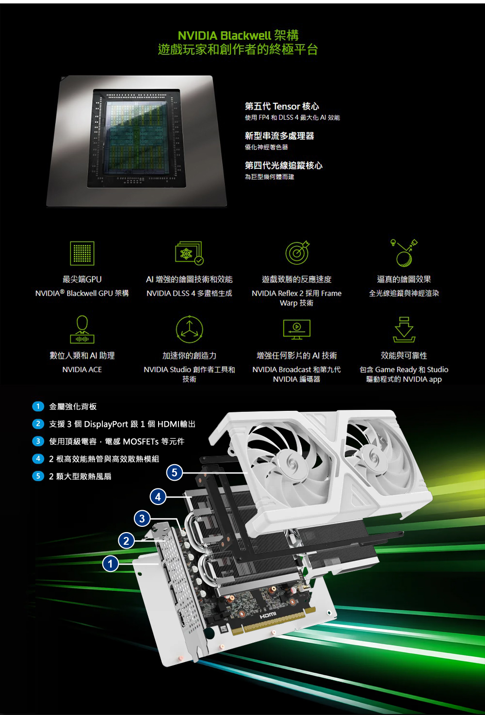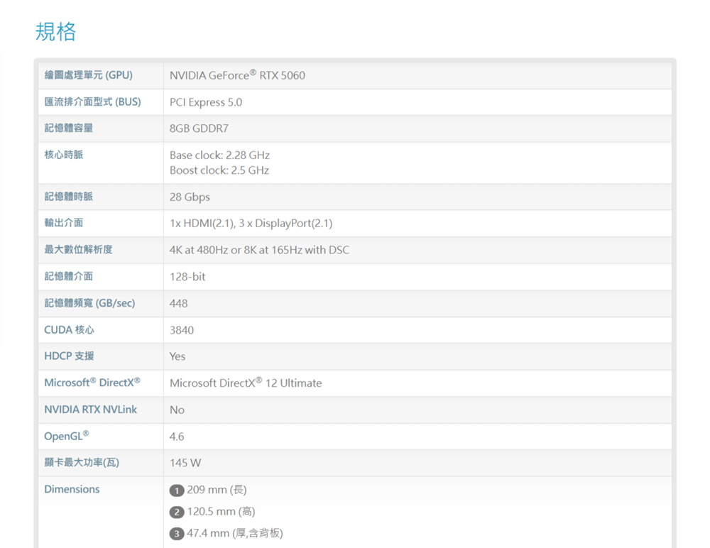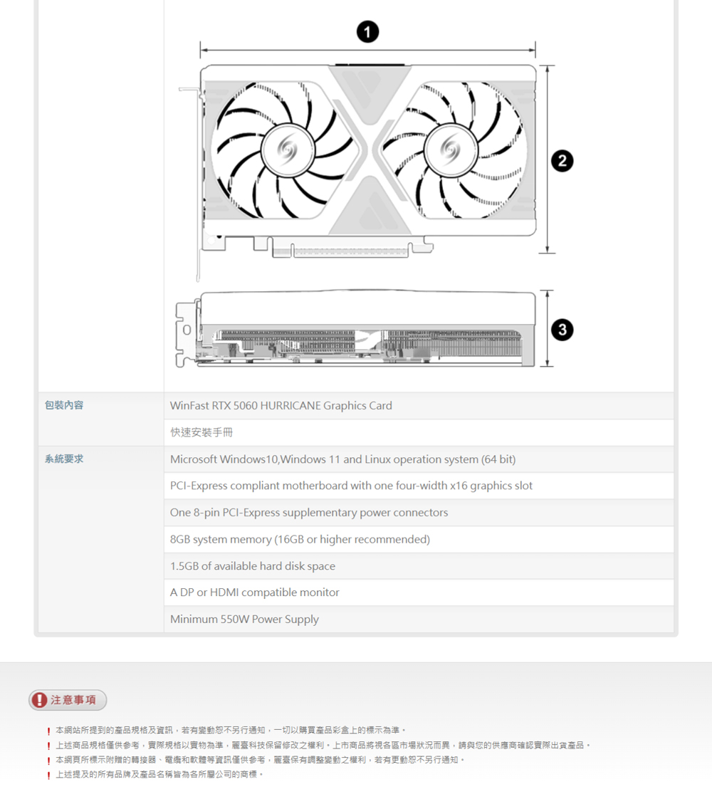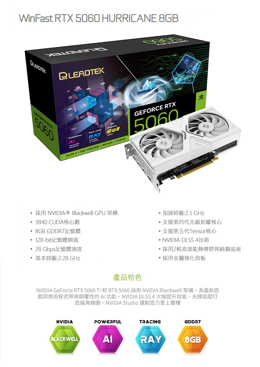 WinFast RTX 5060 HURRICANE 8GB 顯示卡 採用 NVIDIA® Blackwell GPU 架構 3840 CUDA核心數 8GB GDDR7記憶體 128-bit記憶體頻寬 28 Gbps記憶體速度 基本時脈:2.28 GHz 加速時脈:2.5 GHz 支援第四代光線追蹤核心 支援第五代Tensor核心 NVIDIA DLSS 4技術 採用2根高效能熱導管與純銅底座 採用金屬強化背板 看更多 顏色 規格 GDDR7 Download File